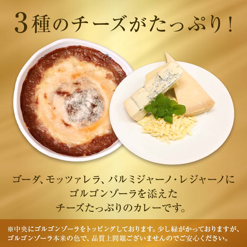 チーズ盛り仕様でお届けいたします。 ゴーダ、モッツァレラ、パルミジャーノ・レジャーノにゴルゴンゾーラを添えたチーズたっぷりのカレーです。 ※中央にゴルゴンゾーラをトッピングしております。少し緑がかっておりますが、ゴルゴンゾーラ本来の色ですので、品質になんら問題ございませんのでご安心ください。