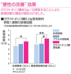 1日5gのガラクトオリゴ糖を摂取することで、1週間あたりの排便回数の増加が認められました。