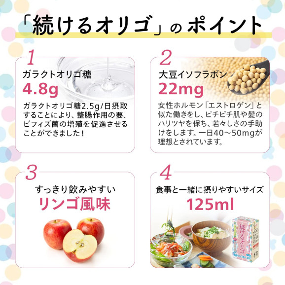 続けるオリゴ1本に4.8gも含まれているガラクトオリゴ糖は、腸内のビフィズス菌を増加させて、おなかの調子を整えます
