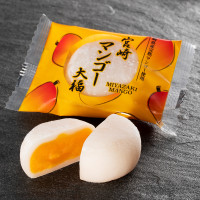 大福の真ん中にたっぷりの宮崎マンゴージャムを入れて特製のマンゴー餡と求肥で包みました。