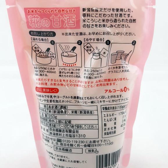 新潟県産米だけを使用した甘酒です。米こうじと米から造られた自然の甘さをお楽しみください。