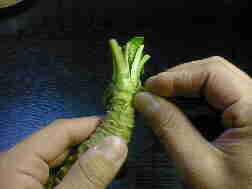 わさびの茎を外側から1本づつていねいに取って行きます。