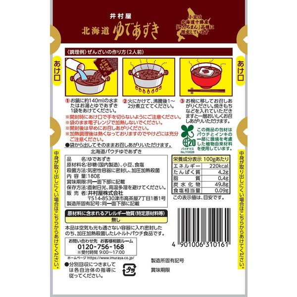 ●北海道産原料のみ使用 風味豊かな北海道十勝産あずき(品種:きたろまん)に、あずきの甘さを引き立たせる北海道産ビートグラニュー糖と北海道産オホーツクの塩を使用。 長年培ってきた技術を活かしたあずきの風味豊かなゆであずきをお楽しみください。 パンケーキやかき氷のトッピング、ぜんざい等にお使いいただけます。 ●環境にやさしく便利なパウチタイプを採用 使い勝手の良いパウチタイプです。パウチとインキの一部に環境を考慮した植物由来材料を使用しています。